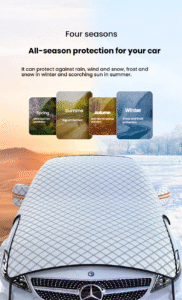 Made with durable, weather-resistant material, it blocks snow, ice, and harsh UV rays—keeping your windshield clear in winter and your car cool in summer. Elastic edges and secure straps ensure a tight fit, while the universal design works for ALL car models. Installs in 10 seconds, no tools needed!